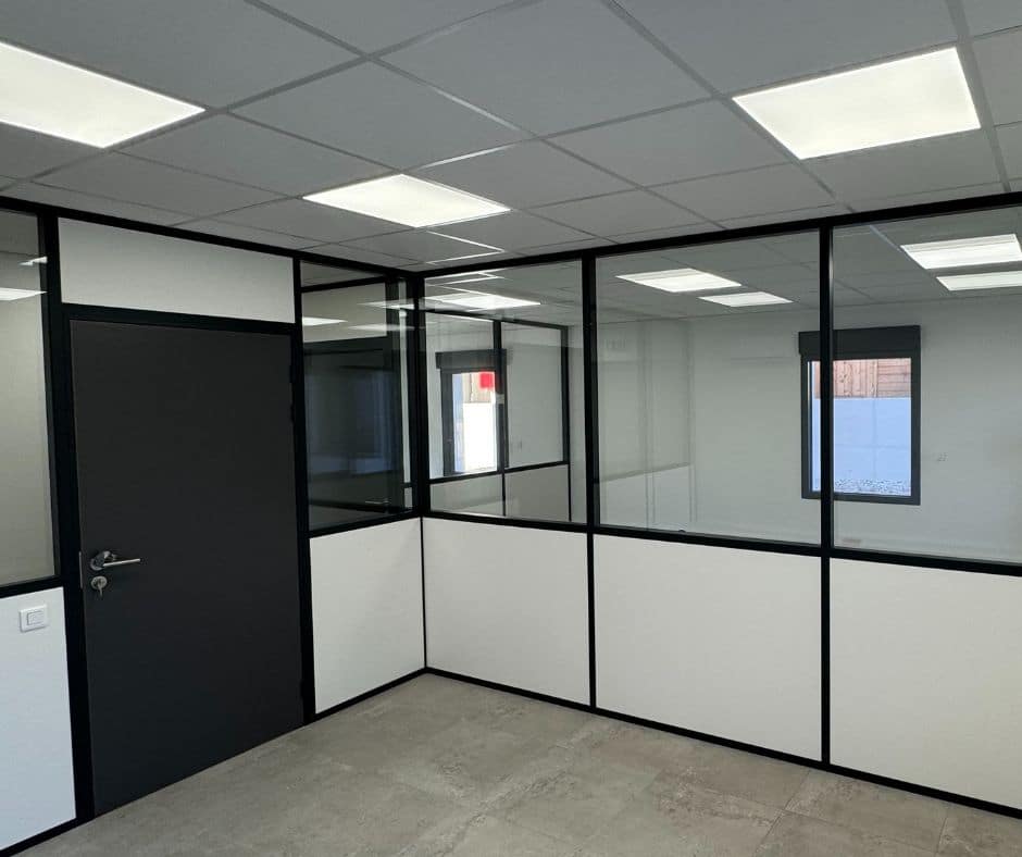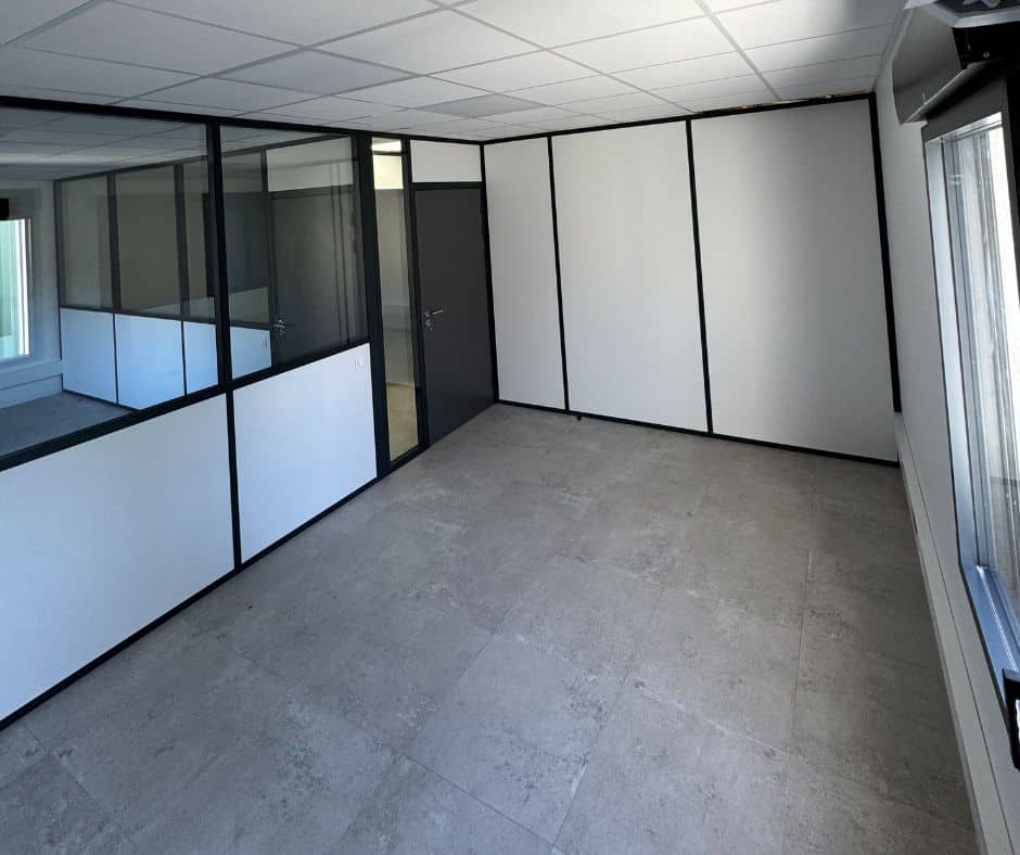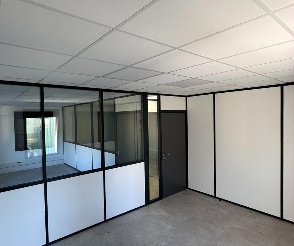 Réalisation de l‘aménagement intérieur de bureaux plâtrerie, faux-plafond, peinture et cloison amovible, à partir d’un agrandissement neuf.